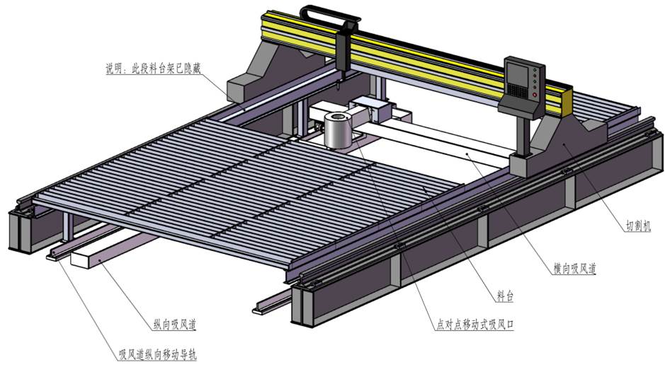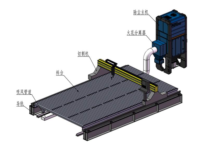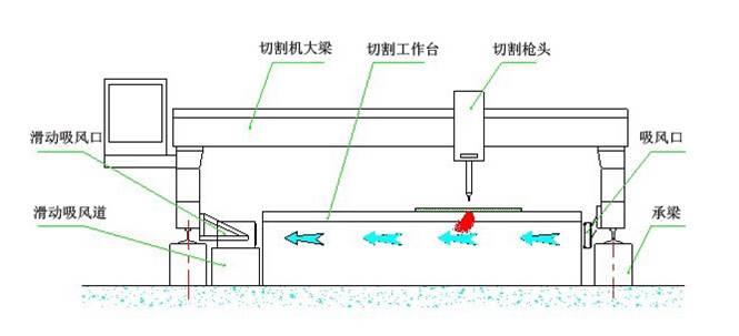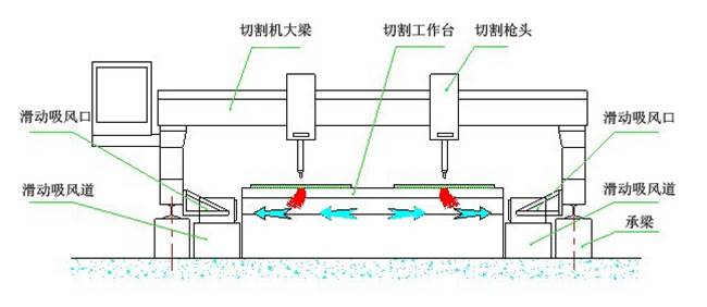 側(cè)吸式煙塵凈化系統(tǒng)采用吸風(fēng)口固定在切割機龍門架上,吸風(fēng)口與吸風(fēng)道之間通過密封皮帶密封,吸風(fēng)口可隨龍門架在吸風(fēng)道上來回移動吸風(fēng),將切割的粉塵吸除。