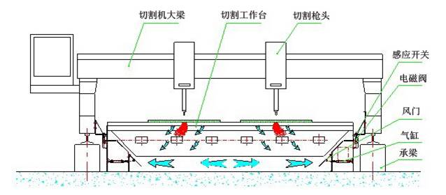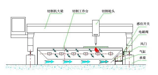 下吸式煙塵凈化系統(tǒng)抽風(fēng)是通過下吸式抽風(fēng)切割臺來實現(xiàn)的,下吸式抽風(fēng)切割臺分成若干個區(qū)域,每個區(qū)域設(shè)計有風(fēng)門吸風(fēng),切割槍頭在每個區(qū)域切割時,相應(yīng)區(qū)域的風(fēng)門打開抽風(fēng),將切割機的粉塵吸除。